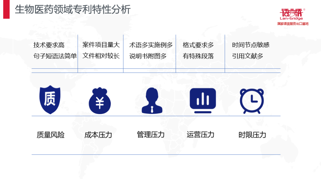 根據(jù)生物醫(yī)藥領(lǐng)域特點(diǎn)帶來(lái)的質(zhì)量風(fēng)險(xiǎn),成本壓力,管理壓力,運(yùn)營(yíng)壓力,時(shí)限壓力,語(yǔ)言橋采用了定制的譯員服務(wù)團(tuán)隊(duì),責(zé)任清晰的,高質(zhì)量,高一致性的專利翻譯服務(wù),使申請(qǐng)人在得到高質(zhì)量的專利翻譯服務(wù)達(dá)到降本增效的同時(shí),也實(shí)現(xiàn)國(guó)際專利的精細(xì)化管理。